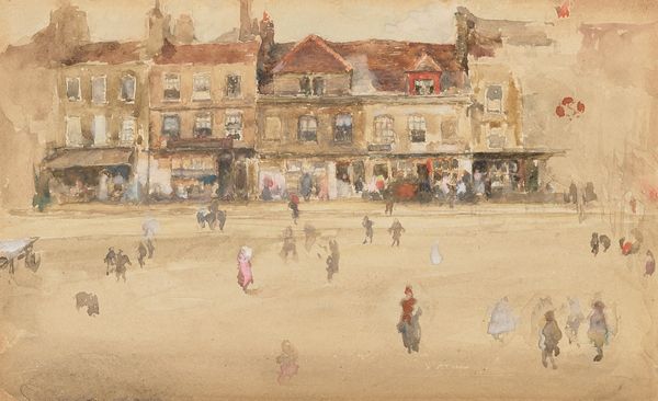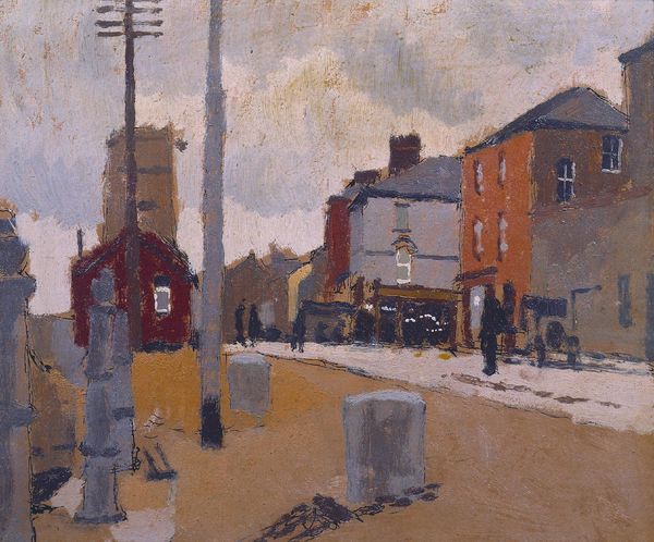 Editor: Here we have Paul Maitland’s "Barges, Chelsea Riverside, the 'Eighties." It’s an oil on canvas piece, and it feels so muted and… London-y. What stands out to you most about this painting? Curator: Well, Chelsea in the 1880s was a fascinating intersection of industry and burgeoning bohemianism. Maitland captures the subdued atmosphere beautifully, doesn't he? Notice how the industrial barges exist alongside what appear to be emerging residential buildings. Editor: Yes, I see that now. It's like two different worlds are coexisting in the same space. Curator: Precisely! It’s a visual representation of the socio-economic tensions simmering beneath the surface of Victorian society. Do you think Maitland is celebrating or critiquing this? Editor: I hadn’t considered that. So much to think about. Thanks! Curator: My pleasure. Art opens up these dialogues.