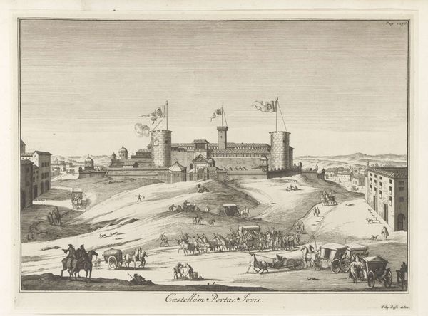 Curator: What immediately strikes me about this 1670 etching by Wenceslaus Hollar, titled "Part of Tangier from above, without the Water-gate," is how meticulously he's rendered the fortifications. There's such a stark contrast between the detailed stonework and the relative openness of the sea and sky. It feels both powerful and fragile at once. Editor: Yes, I see it! The contrast you mention creates a curious tension, doesn't it? I am wondering how the act of reproducing or printing is used here as an exploration or observation of a landscape. We've got these tiny figures almost disappearing, dwarfed by architecture. Curator: Absolutely. Hollar's technique involves engraving and etching which are all about labor. Think about the tools used: burins, needles. And then there’s the printing itself—multiple runs, controlling ink, the paper stock itself, that texture. All these industrial, repeatable efforts result in this single, unique artifact. I'm also curious to learn about the social implications here... It offers views into English aspirations of power in this location through this visual technology of engraving and print making. Editor: True, it really brings to the forefront the notion of observation as a labor of perspective. He chose a vantage point that elevates the viewer, almost implying colonial observation and power—but is it an impartial look? Are there politics involved? I see a great exploration of texture in the towers on the left, there is that strange sense of drama or sublime. Curator: What strikes me too, is the inscription: numbers referencing important landmarks like the Watergate or the English Church, this adds such an informative tone. Editor: You are totally right, its clarity is very clinical, the organization very rational, as if it tried to convince an empire what resources this city possesses... It is so cool to see how the combination of those textures, almost accidental results from the medium itself and this dry informational log offer so much nuance on colonial power. Curator: Exactly! Looking at the ships too, makes me think of movement and trade... Hollar is offering this as a commodity as well. How different would his version of the city would be if he decided to omit these elements and show its own, independent character? Editor: The more I ponder it, the more I realize the image asks more questions than it answers! It speaks volumes about its time. Curator: It's a testament to how even seemingly objective records can hold so much implicit meaning!
