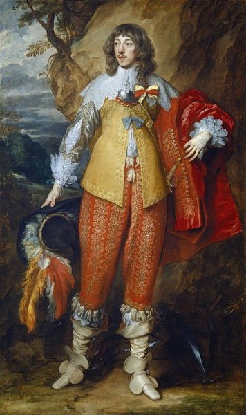Editor: Here we have what seems to be an oil on canvas portrait, portraying Charles Stanhope, the 3rd Earl of Harrington, painted by Joshua Reynolds. I am immediately drawn to the reflections on the armor. What can you tell us about the forms and relationships at play here? Curator: Indeed. Notice how Reynolds uses the impasto technique to create these reflections. Observe how the light doesn't just depict the armor's surface; it actively shapes its volume and form, interacting with the curves and edges. How does this contrast to the flat background? Editor: The clouds behind the subject lack such texture, making the subject appear more dramatic, more prominent in the visual field. Does that choice play into some system of meaning within the image? Curator: Precisely. The painting's composition uses contrasts of light and texture to create a focal point. What can you say of the red sash in relation to the gray of the steel armor? Editor: I see what you mean - the color highlights a strong diagonal that draws attention to the figure's commanding presence. And that subtle inclusion of another figure suggests perhaps the trappings of colonial England? Curator: Note Reynolds' employment of chiaroscuro, not just for dramatic effect but also to sculpt the forms of the figure. How does the light falling upon the face inform the overall impression of the character depicted? Is that character simple or complex? Editor: Good question! The play of light creates complexity within a straightforward image, making the depicted subject somehow grander than his simple presentation suggests. I hadn't considered that! Curator: And how might we describe the formal relationship of subject to the space and events around him? Editor: Reynolds definitely gives the Earl a commanding presence by manipulating the lighting, texture, and formal relations within the frame. Thanks for highlighting that, it enriches the work so much!