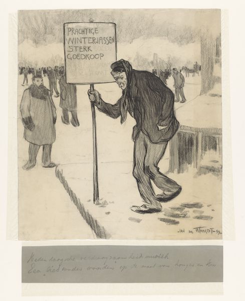 Curator: Look at this print from Anton Molkenboer, titled "Nieuwejaar," likely from 1896. What strikes you most about it? Editor: It's a bustling winter cityscape! You can almost feel the crisp air and the faint melancholy of the bare trees against those sturdy, homely buildings. It's all sketched with this wonderful, scratchy energy. What materials were employed here? Curator: The work relies on drawing and printmaking techniques, primarily using ink on what appears to be aged paper, perhaps even homemade given the description, lending to the antique atmosphere. Note how Molkenboer seems to have composed this as part of a sketchbook, as evidenced by the style. The choice seems fitting considering its thematic interest in tradition and home life. Editor: Interesting! Looking at the composition, it seems this work leans heavily into its material conditions. Notice how the line work, and its method of reproduction as a print, affects its legibility but also adds this wonderful temporal texture to it all. This isn't just a snapshot, it's an object testifying to time, skill, and maybe the daily newspaper it was printed for. How might Molkenboer's choice of medium—the accessible newspaper medium for example—influence its reach or even its value in society then? Curator: Possibly to increase the feeling of a fleeting, transitional moment, capturing the lively spirit of the New Year celebration while underscoring a communal theme of togetherness that is literally "printed". The use of caricature almost veils this spirit beneath familiar, smiling, gentle, if peculiar, faces. Editor: I agree; looking closely at that ink, each figure is made both strange and familiar through that lens, the paper too carries all this temporal meaning while it carries the sketch to us! A nice touch is the inclusion of that aged patina. I appreciate its dedication to capturing its subject from the standpoint of someone intimately engaged in his moment in time. It’s not mere reproduction but truly material engagement. Curator: Exactly. This wasn't a removed experience and what Molkenboer really delivers is not merely an urban sketch, but more, let's say, something of a page in his journal capturing fleeting vignettes that comprise the feeling of community in the face of seasonal transition. Editor: Ultimately, I find this image, despite its medium and modest aims, quite remarkable in demonstrating art as work, record and social artifact, reflecting culture itself.