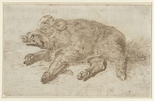 Editor: So, this drawing is called "Sleeping Fox" by Gerard ter Borch, made before 1662. It’s currently at the Rijksmuseum. It’s done with pencil and charcoal… it has a very quiet, peaceful mood. What do you see in this piece? Curator: This fox, curled in slumber, speaks volumes. In the Dutch Golden Age, animals often transcended simple representation, becoming potent symbols. Tell me, what qualities do you associate with a fox? Editor: Cunning, maybe? A bit mischievous? Curator: Precisely! The fox, in folklore, often embodies intelligence, resourcefulness, but also deception. Now, consider a sleeping fox. Is it still cunning? Or is there vulnerability exposed? Editor: Hmm, I see what you mean. Sleeping, it's disarmed, right? So is Ter Borch perhaps suggesting even tricksters have moments of vulnerability, or rest? Curator: It is an interesting reading. Furthermore, Ter Borch has captured a familiar posture and pose in his rendering of the animal’s sleep. Note the shadows rendered beside the fox to add weight. The fox may signify societal shrewdness in repose. What else do you notice? Editor: It is in coloured pencil but subdued – a natural, realistic, informal depiction. What else could "Sleeping Fox" be symbolizing? Curator: Perhaps the illusion of control. A sleeping fox, though seemingly powerless, could be gathering its strength for the next venture, embodying the deceptive appearance versus potent reality. The image might encourage people to ponder the dual nature of rest. It's food for thought. What are your impressions now? Editor: I guess it's about pausing and considering the many hidden angles that lie within simple imagery. Thanks! Curator: Exactly! Symbolism enriches art, inviting deeper engagement. Glad to share this perspective!