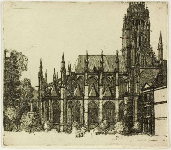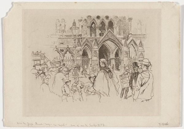 Curator: Let's turn our attention to Charles John Watson's etching from 1904, "La Chapelle de St. Esprit." The image resides here at the Art Institute of Chicago. Editor: What a delicate balance of stillness and movement. The church looms with incredible detail, while the figures below feel fleeting, almost sketched in. Curator: Precisely. Note how the composition is structured: the rigid, orthogonal lines of the gothic architecture contrasted with the fluid, curvilinear forms of the figures populating the square. Observe the values at play. See how the artist renders a sense of depth, even in the limited tonal range of the etching process. Editor: The church as a backdrop to everyday life, almost like a stage. Those stalls in the foreground remind me that this sacred space is also a communal hub. Markets were, and often still are, a potent symbol of everyday life lived out under the eyes of the divine, wouldn’t you agree? Curator: I find it structurally interesting, the way Watson handles perspective, compressing the space vertically to emphasize the facade. Editor: Think about the psychological weight this imagery would have carried. Churches were not just places of worship, but symbols of power, refuge, stability. Curator: Observe how Watson's style borrows from Art Nouveau's decorative tendencies, and how it manifests itself as ornate, almost excessive detailing, softening the building’s overall imposing architecture. Editor: I notice all of the repeated arch motifs. Even in printmaking, these echoes feel celebratory. I wonder how many passed through that entrance searching for sanctuary or guidance. I suspect quite a lot of people, indeed, have had their important life experiences take place around such portals as those pictured in "La Chapelle de St. Esprit". Curator: And, isn’t it amazing how the distribution of black ink on paper creates such volume. Let’s not disregard how the marks define all aspects of the design itself, with the density suggesting depth, form and content? Editor: Very interesting indeed, you’ve given me quite a lot to ponder. Curator: Indeed, this exercise in tonal relationships of an artist thinking about his position within early modernism is deeply engaging.