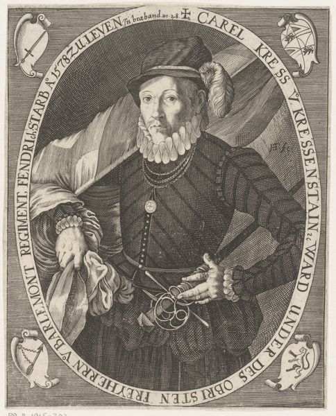 Editor: This is Lucas Vorsterman I’s “Portret van Thomas Howard, graaf van Norfolk,” created between 1624 and 1630, a baroque engraving at the Rijksmuseum. It's striking how the detailed fur trim contrasts with the rather plain background. What does this portrait say to you? Curator: I see a representation of power inextricably linked to the fraught sociopolitical climate of its time. Howard's opulent attire speaks of his aristocratic privilege, a privilege built, in part, on the backs of a struggling populace. His stiff pose and gaze evoke the complexities of the English aristocracy during a time of religious and political turbulence. Editor: Religious turbulence? How so? Curator: The Reformation had reshaped England. The Howard family were prominent Catholics, navigating a landscape dominated by Protestant rulers. Portraits such as these served to solidify their legacy. But is this also an act of defiance in the face of societal pressure? It is important to also consider what these families might have experienced at that time, facing continuous pressures, political maneuvering, and the ever present threat to their status. Editor: That's fascinating. I hadn't considered the tension between outward display and underlying vulnerability. The canes suddenly seem less like status symbols and more like something else. Curator: Precisely! What else might they represent? Consider the restrictions that class placed on them and the pressures from different groups of people. Editor: This print, seemingly straightforward, reveals how art embodies intricate power dynamics. I will never look at these kinds of portraits the same way again. Curator: It underscores how art serves not merely as a reflection, but as an active agent in the construction of historical narratives and identities. Thinking about it makes me look at the past and present in another light!