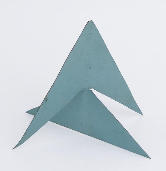 Curator: Here we have Hannes Beckmann's "Construction in Sheet Metal," an intriguing sculpture currently residing at the Harvard Art Museums. Editor: My first impression is one of delicate balance; the geometric shapes create a sense of precarious stability. Curator: Beckmann's work often intersects with the social and political upheaval of his time; one wonders if the sculpture reflects the tensions of the interwar period? Editor: Perhaps. But the formal qualities are equally compelling. The contrasting colors, the angularity, and the way the light plays across the surfaces create a dynamic visual experience. Curator: It's interesting how you draw attention to the interplay of light, especially considering the potential symbolic weight of geometric forms in art history. Editor: Indeed. And through a close examination of materiality and composition, we can find both artistic intent and social commentary. Curator: A fitting end to a discussion that bridges form and context. Editor: Illuminating how art can reflect both our inner and outer worlds.
