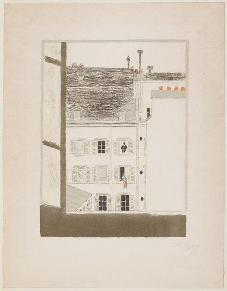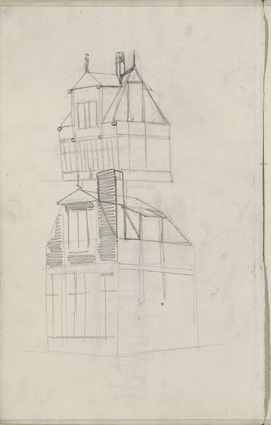 Editor: So, here we have Roger Vieillard's "Temple de la Liberté," an etching. It feels like a skeletal cityscape, all lines and implied space. What jumps out at you when you look at it? Curator: The grid, immediately. Notice how it overlays the architectural forms, almost as if the ‘Temple’ is simultaneously under construction and deconstructed? The grid is a potent symbol. In classical iconography, the grid is often used to represent order, reason, and even control. But here, it seems… porous, unstable. Editor: Unstable, yes! I see the workers at the bottom, maybe building the structure? Is there a relationship there, between them and the temple? Curator: Precisely! The temple itself – a symbolic space – is being constructed by those figures below. But notice the 'Temple de la Liberté' sign is almost crumbling. Vieillard is drawing our attention to how these ideas of freedom, and the institutions that represent them, are built and, perhaps more importantly, how easily they can erode or become prisons themselves. Consider how cage-like the structure appears. Editor: I hadn't thought of it as a cage, but that makes so much sense, especially with the title. The temple is not necessarily liberating! Curator: Exactly. And look at the floating staircases, disconnected from the main structure, echoing Escher-like paradoxes. This disrupts any easy reading of progress or ascent within this ‘temple.’ It suggests freedom might be an illusion. Editor: Wow. I went from seeing an interesting cityscape to a meditation on the fragility of freedom itself. Curator: Visual symbols, as you see, often invite deeper reflection. The interplay between structure and disintegration, order and chaos reveals multiple layers of interpretation. The piece doesn’t preach; it asks us to consider these complexities.