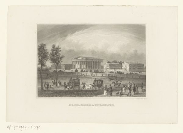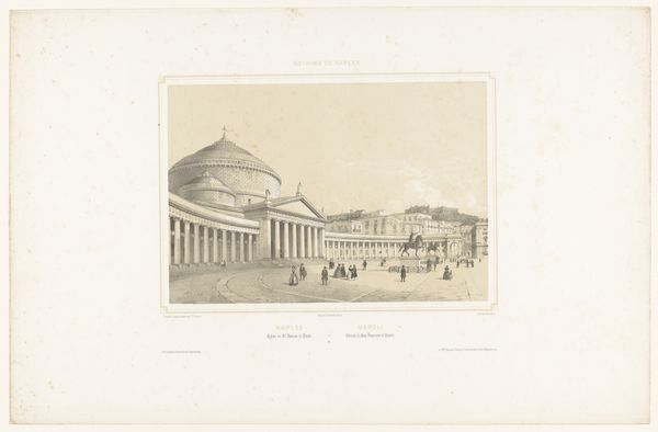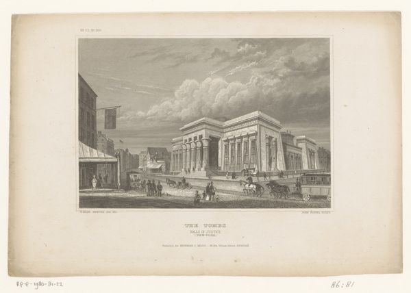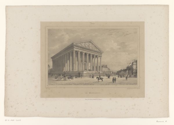 Louis-Julien Jacottet’s ‘Zicht op het Palais Bourbon’ offers us a muted vision, rendered through lithography. The overall effect is one of classical restraint. The Palais Bourbon is presented as a temple of order, its architectural precision mirrored in the careful linework. The composition divides into three distinct horizontal layers: the building, the flat open area in front, and the sky. The building, framed by its imposing columns, is a study in horizontality and verticality. The flat space in front with people and carriages almost seems to emphasize the depth and scale of the Palais Bourbon, which looms with a sense of permanence. The sky, lightly touched with clouds, balances the weight of the architecture below. The appeal lies in the subtle play of light and shadow, particularly in the articulation of the building’s facade. The lithographic medium allows for delicate gradations, creating a sense of depth and texture. What does it mean to monumentalize buildings of government? Consider the forms and how they create meaning.