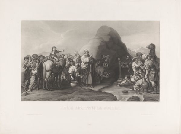 Curator: James Henry Watt's "Procession of the Flitch of Bacon" depicts a large group, many on horseback, in what seems a festive, though somewhat unclear, event. Editor: The eye certainly moves around a lot; it seems chaotic at first glance. The composition doesn't quite settle. Curator: Right. The historical context is key here. This work likely represents a social ritual, the 'Flitch of Bacon' tradition, where a married couple proves their marital fidelity to win a side of bacon. Editor: So, the flitch symbolizes marital success, almost like a trophy? But the scale feels off, doesn't it? The figures are rendered with such detail, yet they seem somewhat flattened against the backdrop. Curator: That flattening is interesting. Watt's printmaking process involved intense labor, translating a scene of communal labor and judgment into a commodity. The image itself enters into a circulation of social values. Editor: I find myself drawn to the couple at the center; their pose and the subtle shading suggest an almost theatrical display of virtue. Curator: Indeed. The print serves as a visual record of a performance, a mediated form of judgment on domestic labor and morality. Editor: Thinking about this piece, I now appreciate its ability to capture both a cultural moment and the artifice inherent in its presentation. Curator: Precisely. It invites us to consider the values and social structures underlying even seemingly simple traditions.