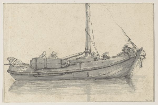 Pieter George Westenberg made this drawing of a ship with the bow turned to the left with pen and grey ink and grey wash. This piece gives us a glimpse into the bustling maritime culture of the Netherlands, likely created during the first half of the 19th century. During this period, the Dutch economy relied heavily on shipping and trade, so images of ships held significant cultural and economic importance. The precise details of the rigging and hull speak to Westenberg's familiarity with shipbuilding and seafaring life. It also tells us about the institutional histories of art academies and the demand for marine artists to record the likeness of particular ship types. We might consider how the drawing reflects the social conditions of its time. Does it romanticize maritime life, or does it offer a more realistic portrayal of the working conditions aboard such vessels? Historians can consult shipping records, maritime museums, and archival documents to gain further insights. This drawing offers a window into a crucial aspect of Dutch society and economy.