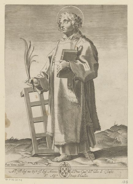 Cornelis Visscher created this engraving of Saint Marcellinus, part of his series "Saints of the North and South Netherlands," during the Dutch Golden Age. This was a period marked by unprecedented economic growth and cultural flourishing, but also intense religious and political conflict, particularly between Catholics and Protestants. Visscher, working in this environment, chose to depict a Catholic saint, Marcellinus, imbuing him with symbols of authority: a cross-topped staff and a book. The halo around Marcellinus’ head signifies his holiness, yet his earthbound stance and solemn expression also humanize him. The print served as a form of cultural memory, preserving and celebrating Catholic figures in a society undergoing religious transformation. This image reflects the intersection of faith, identity, and artistic expression in a period of profound social change. It encourages us to reflect on how individuals navigate their beliefs and traditions amidst shifting cultural landscapes.