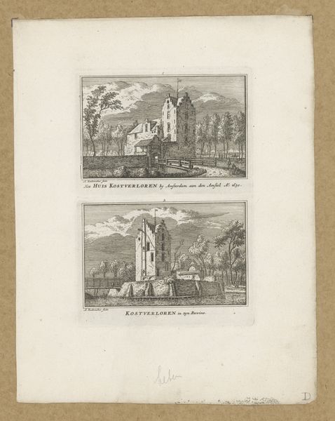 Abraham Rademaker created these two images of Gezichten op Houtewael in pen and brown ink with a brush. The composition is divided into two distinct scenes, each framed within its own rectangle, creating a diptych effect on a single sheet. Each scene captures landscapes along the Houtewael, near Amsterdam, rendered in delicate lines that define form and space. Rademaker uses the pen to meticulously depict the trees, buildings, and figures, emphasizing the linear elements that guide the viewer's eye through the composition. Notice how the sky, filled with clouds, contrasts with the detailed earth below, creating a balance between the atmospheric and the concrete. The structure of the print, with its organized layout and contrasting scenes, reflects a rational approach to landscape art. The scenes are designed to invite contemplation of the natural and constructed environments, inviting the viewer to decode the visual symbols and cultural codes embedded within. The attention to linear detail and structured composition invites us to consider how art constructs meaning through form and representation.