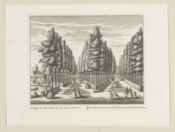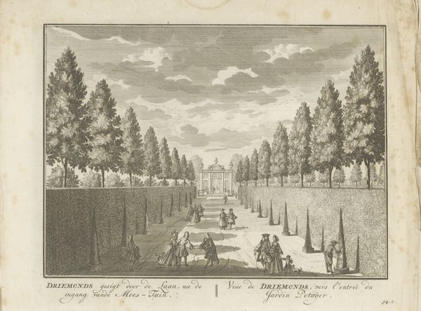 Editor: This is "View of the Grand Avenue in St. Petersburg" by Daniël Stopendaal, created around 1719, using ink on paper. It's a fascinating cityscape! The sheer linearity is quite striking, isn't it? All those meticulously placed trees really emphasize perspective, but at the same time feel a bit...oppressive. How do you interpret this work? Curator: Indeed. Note the strategic deployment of line, directing the eye relentlessly into the vanishing point. The stark contrast between light and shadow creates a compelling, almost theatrical space. The forms are rigidly controlled; consider the trees, their shape and the rigorous pattern. What structural devices do you observe creating the dominant perspective? Editor: Well, obviously the trees diminish in size as they recede, and the road narrows quite dramatically. The artist also places that distant structure, possibly a palace, right at the vanishing point, which reinforces the effect. Curator: Precisely. And it's in these compositional elements, that Stopendaal crafts meaning. The artist has chosen to depict this location from what we might term a 'receding' perspective. I wonder, what ideological underpinnings can you ascertain from the employment of the artist's materials of paper and ink, or how they are applied? Editor: That’s a clever observation. Perhaps it shows the artist's belief in the strength and infinite nature of the city itself, creating the illusion that the landscape has no edges or limit. Thank you for guiding me to look beyond the obvious, this was enlightening. Curator: My pleasure. By appreciating how structure shapes visual language, our engagement with the art itself matures; and this enriches our understanding beyond the subject.