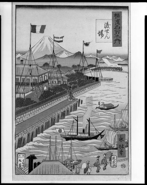 Curator: Hokusai's "Fuji with a Rocket" from his *One Hundred Views of Mount Fuji*, is a striking woodblock print that gives us insight into 19th-century communication. It's part of a larger cultural phenomenon around the symbol of Mt. Fuji itself. Editor: It's like a dream! The ascending smoke contrasts with the serene Fuji backdrop and all those tiny ships. The composition is so dynamic, even with the limited color palette. Curator: The "rocket" refers to signal fires, key for relaying information swiftly. Hokusai often embedded social commentary within his landscapes. Editor: The figures tending the fire seem almost to be launching the smoke, it's as if they're igniting the landscape itself. It makes me feel a sense of urgency and connection. Curator: This piece underscores how landscapes became stages for national narratives and technological advancements. Editor: It's thought-provoking how the fleeting smoke contrasts with the iconic permanence of Mount Fuji. Curator: Indeed, it reflects how art captures both the eternal and the ephemeral aspects of society. Editor: Absolutely, and the artistic vision transforms it into something timeless.