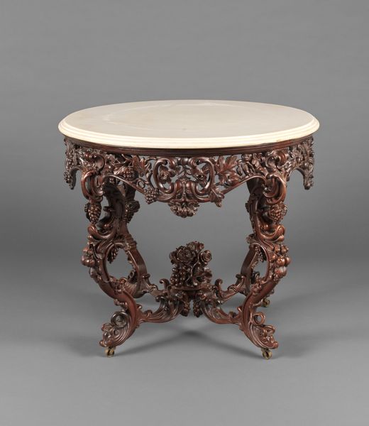 Curator: It appears weighty, doesn’t it? A very deliberate use of symmetry, giving it a self-assured stance. Editor: Indeed. What we are viewing is a Pedestal Table, dating to around 1810, crafted in England and attributed to Thomas Hope. This remarkable piece currently resides here at The Art Institute of Chicago. It is made primarily of wood, expressing characteristics of Neoclassicism blended with hints of Orientalism. Curator: Orientalism? I suppose those stylized paw feet grounding the piece provide that flavor. Although, on closer inspection, they don’t detract from its overarching classical statement. Their weight creates a tension against the tabletop. Editor: You’re astute in recognizing the convergence of styles. Thomas Hope, the designer, was quite influential in promoting neoclassical taste in England. He had traveled extensively and brought back decorative ideas that he incorporated into his designs. He wanted to elevate British design to rival ancient Roman or Greek styles. Curator: So, the table functioned not merely as furniture but also as a statement? A kind of socio-political announcement. I see those gilt details, adding visual drama. They must have really popped in a candlelit room. Editor: Precisely. Pieces like this helped him communicate cultural power through design, influencing trends and demonstrating an understanding of how objects project an aura of class and sophistication. One should consider it was not just functional: furniture such as this was a tool used in shaping culture, taste, and status in English society. Curator: Well, that has certainly changed the way I now see the details of the piece—from paw feet to those concentric circles embedded in the table surface. I was just focused on line, texture and volume. Editor: It's important to appreciate how design actively shapes cultural conversations.