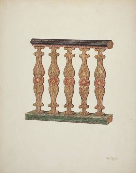 Editor: This is Hal Blakeley's "Painted Wall-stand for Flowers, etc." from 1939. It looks like a mixed media drawing, or maybe a watercolor painting. It’s quite charming and feels very rooted in a specific place and time. What strikes you when you look at it? Curator: I see a fascinating intersection of folk art traditions and regionalism, common in the US during the 1930s. It makes me think about the romanticization of rural life during a period of great social and economic upheaval. Who was this artist making this image for, and why? Do you think the artist was actually representing a real, existing object, or was creating an idealized version of folk culture? Editor: That's a great point. It does feel a bit idealized, maybe even nostalgic. What aspects of the piece lead you to interpret it through that lens? Curator: The meticulous rendering of the painted decorations, almost too perfect, too clean. It lacks the wear and tear of actual use. Think about the broader social context: the Dust Bowl, the Depression. The choice to depict this quaint, decorative object speaks to a desire for simpler times, a longing for cultural identity rooted in a romanticized past, and, by extension, a need to address how folk art may often obscure the harshness of life for many rural communities at that time. Who did this imagery exclude or perhaps unintentionally erase? Editor: That’s really fascinating. I hadn’t considered it in terms of the socio-economic context of the time. Now I see how it might be less a straightforward celebration of folk art and more a complex commentary on a nation in transition. Curator: Exactly! By interrogating these images and their role in shaping cultural narratives, we can better understand the complexities of the past and how they continue to influence our present. This is folk art representing a region in crisis and transition; it needs our continued and empathetic attention. Editor: I'll definitely look at art from this period differently from now on. Thanks for the insightful perspective!