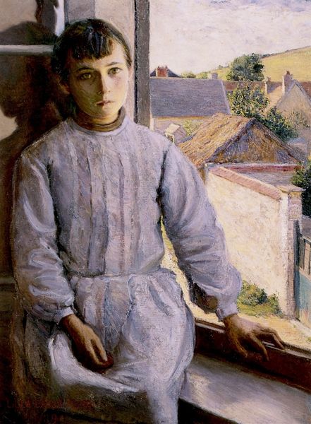 Editor: So, here we have Frédéric Bazille's "View of the Village of Castelnau-le-Lez," painted in 1868. I'm struck by the juxtaposition of the young woman in the foreground against the sprawling village in the background. It feels very staged, almost like a portrait within a landscape. How do you interpret this work? Curator: This piece sits at a fascinating intersection. We see Bazille grappling with the established conventions of portraiture, while simultaneously engaging with the burgeoning Impressionist movement through its plein-air execution. It's not just a portrait "within" a landscape, but a deliberate placement of a Bourgeois woman, marked by her finery and leisure, within the landscape of Southern France. How does that tension strike you, the contrast of social class and geographical location? Editor: That makes me think about who had access to these leisurely country escapes. So it becomes more than just a pretty scene. Curator: Exactly! Consider also Bazille’s own privileged background. He's not just painting what he sees, but also reflecting the socio-economic realities of his time. The female subject is posed in the shade looking at us; however, the background landscape and the positionality of Bazille and his subject tell a different story, an interesting class narrative, wouldn’t you agree? What does the young lady *see* beyond her vantage point, and what are we invited to contemplate by looking at *her* looking? Editor: It’s almost like she’s a gatekeeper, filtering our view. So Bazille uses her presence to guide our interpretation of the landscape and social commentary. Curator: Precisely. It challenges us to think critically about who is represented, how they are represented, and what that representation tells us about power dynamics of 19th-century France. We have to look at what this artwork does. It’s not merely passive observation; it's active construction. Editor: I never thought about landscape paintings in that way, as constructs loaded with social meaning. Thanks for expanding my perspective! Curator: And thank you for noticing the nuances in Bazille’s work. Recognizing art as a dialogue allows for transformative readings.