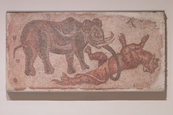 Editor: Here we have "Hounds from Nubia, Tomb of Rekhmire" created around 1479 BC. The artist is Nina de Garis Davies, and the work is located at the Metropolitan Museum of Art. What immediately strikes me is how linear and stylized the dogs are; they're not exactly realistic, but that gives them a real graphic power. What do you see in this piece from a formal perspective? Curator: Indeed. Focus first on the visual vocabulary deployed. Notice the sinuous lines that define the contours of each hound. Observe, too, how the artist eschews naturalistic representation for a more schematic approach. What is the effect of the superimposition? Editor: The effect is…well, I see how they’re all individual dogs, but the overlapping makes them almost flatten into one another, like a pattern. The use of similar colors also adds to that effect. Is it just about the formal relations between shapes? Curator: Precisely! Consider the restricted palette – earth tones, ochre, with sparing use of red. How does the color impact the visual reading of the artwork? The subdued color choices and how that relates to the implied texture contribute to the artifact's overall impact. Editor: The color, especially with the linear rendering, definitely contributes to the flattened, decorative quality, a real emphasis on surface. The medium also appears old and weathered. Curator: A keen observation. The texture further removes any naturalistic qualities. The overall composition has rhythmic structure in its patterns and use of repeating forms. Now, what are your final thoughts? Editor: I was initially just responding to its look, but now I'm realizing how much of the visual impact comes from those design decisions about line and color that you highlighted. Curator: Precisely! The artist created a decorative pattern by choosing lines, hues, and an unorthodox overlapping method for portraying canines.