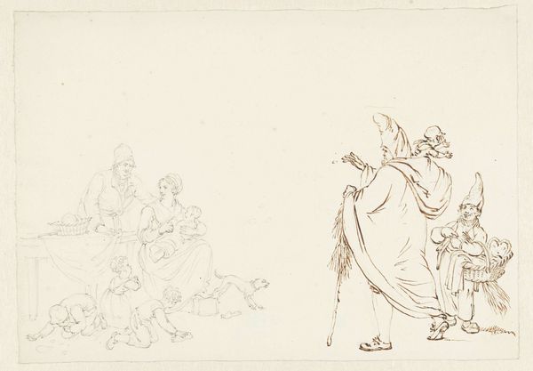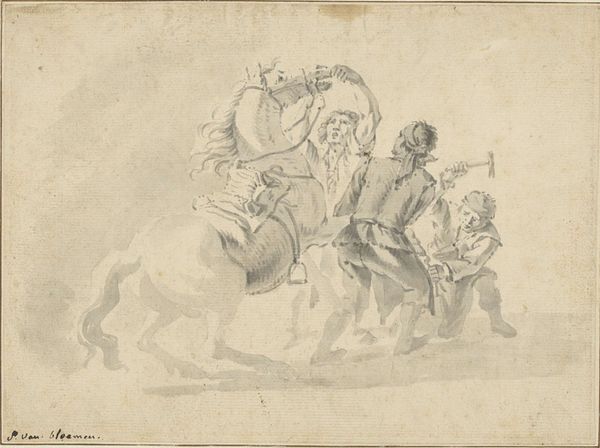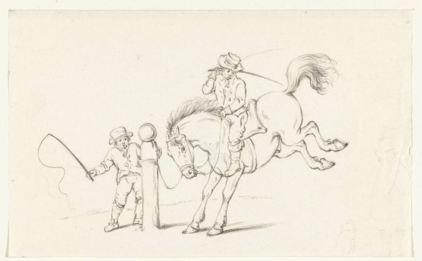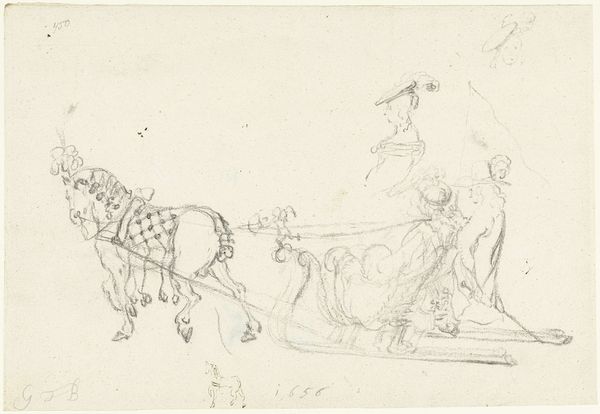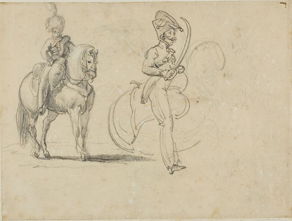 Curator: This is "Boerin met kruik op het hoofd en een valkenier te paard" (Peasant woman with a jug on her head and a falconer on horseback), a pencil drawing by Hendrik Abraham Klinkhamer, made sometime between 1820 and 1872. Editor: The sketch feels almost ghostly. These lightly drawn figures barely exist on the page. Is it a finished work or a preliminary sketch? Curator: More likely a preliminary sketch, yes. Note how lightly Klinkhamer renders both the woman and the equestrian figures. She carries a large jug – a potent symbol of fertility and sustenance – while the falconer, usually associated with nobility, holds his bird aloft. Perhaps a commentary on social roles? Editor: I’m struck by how little ink the artist invests in defining these people. Was it a paper scarcity, perhaps impacting how artists approached draftsmanship at the time? Or might the sketch’s incompleteness reveal certain class-based assumptions about whose images warranted a full commitment of resources? Curator: Intriguing to think about, though I suspect it’s more about capturing a fleeting idea. The juxtaposition itself is what grabs my attention: a woman burdened, contrasted against figures on horseback in flight. Editor: But see how her garments and the horse’s tack are handled! Broad pencil strokes indicating mass produced goods, contrasted against a delicate precision evident in the falconer's garb that evokes older artisanal methods. Even the use of pencil creates its own symbolic register through mark making. Curator: Perhaps the lightness emphasizes ephemerality, the transience of rural life versus the more permanent status of the equestrian class... This kind of work is valuable for understanding how the symbols connected with these class differences were communicated through this medium at the time. Editor: Indeed. To view these as not simply depictions but evidence of the act of producing and as such tells a vivid tale. A beautiful reminder to look closer, not just at the images themselves, but at the means of their creation, and what it implies about production and power at the time.