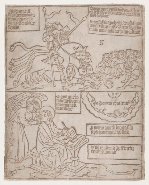 Editor: This woodcut, "St. Jerome", likely created in the 15th century by an anonymous artist, feels so busy! My eye bounces all over with the text, the crucifix, the lion… I’m drawn to the almost cartoonish quality of the rendering, which contrasts the solemn religious subject matter. What jumps out at you in terms of composition and structure? Curator: Formally, it is a fascinating confluence of flatness and depth. The lines create a distinct boundary; even the shading mimics the outlines. Note how the artist delineates space through this almost graphic construction – foreground, middle ground, background. Consider also how the text functions; not just as narrative, but as a dynamic compositional element, coiling around the saint. Editor: So, you are looking past the fact that it's a saint and more at how the components fit together? I keep getting stuck on the somewhat naive representation of perspective. Curator: Precisely! Forget, for a moment, about St. Jerome himself and observe the construction. Are we meant to accept that the lion exists on the same plane as the kneeling saint? Look at the lion; does its posture and execution indicate any understanding of anatomy? Consider also the contrast in execution – the text has crisp linearity, while the rendering of the landscape is much more abstract. Why might the artist adopt this juxtaposition? What kind of energy and dissonance does this tension provide? Editor: That makes sense, focusing on these formal choices that affect our viewing, rather than historical meanings. It changes how I approach the image; I now appreciate its deliberate use of varying styles. Thanks! Curator: Indeed. By closely analysing the stylistic incongruities and spatial rendering, one begins to grasp the print's visual and textual interplay; ultimately transforming one's appreciation for the artwork’s structural logic.