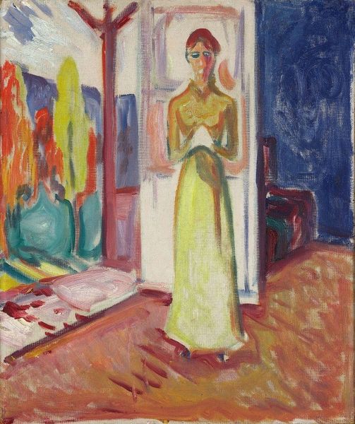 Edvard Munch made this painting, *Woman Seated on a Couch*, sometime around 1919, and it's just bursting with color. The way Munch lays down these pastel strokes, it's like he's wrestling with the paint, trying to capture a feeling more than a perfect image. Look at the woman's blue skirt, how the strokes of pigment almost vibrate with energy. You can practically feel the texture of the canvas underneath. I love how the marks build up, thick in some spots and thin in others, creating this sense of depth and movement. And then there's that rug! A chaotic but joyful pattern that anchors the scene, it's like a party happening right there on the floor. Munch reminds me of Bonnard, how they both use color to express interior states. In the end, it’s not just about what we see, but how we feel when we look at it.