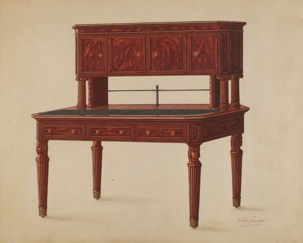 This watercolor painting depicts a Sheraton Sideboard by Amos C. Brinton. The cool tones of the paper subtly contrast with the warm browns of the wood, creating a visual harmony. The sideboard is rendered with careful attention to the linear details and geometric forms which, together, define the composition. The piece embodies the visual language of architectural drawing, where precision serves to articulate structure and proportion. We can see the composition as a study in semiotics. The sideboard’s design is filled with signs and symbols of its function as a domestic object. Note how the symmetry and the clean lines suggest a sense of order. Consider how Brinton uses line and form to negotiate the boundary between function and representation. The watercolor emphasizes not just what the sideboard is, but also its conceptual presence, inviting a reading of cultural codes which may have informed the artwork's making and reception. The artist does not give us a singular meaning, but rather an ongoing interpretation of design.