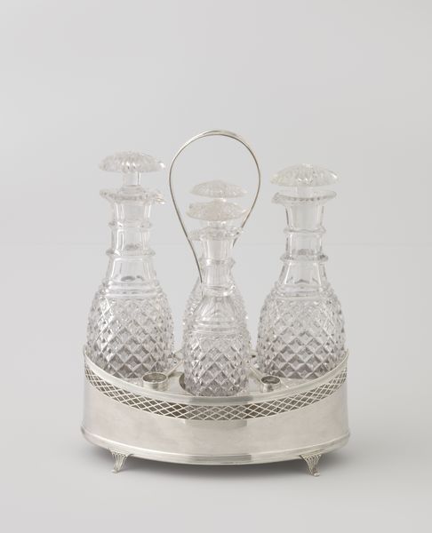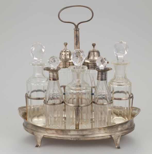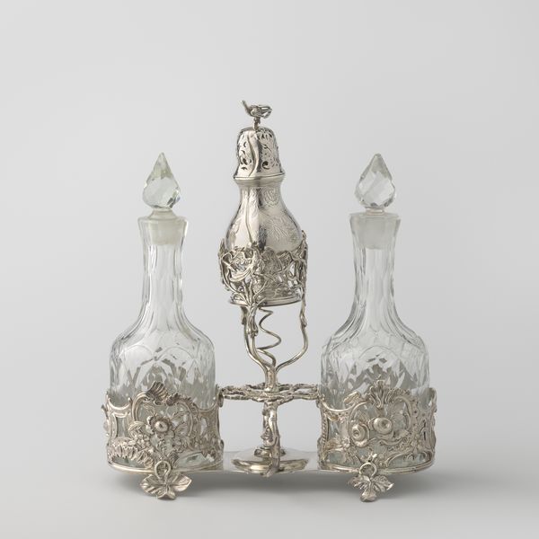This oil and vinegar set with four bottles and the Clifford family crest was made by Fa. Diemont. In the Netherlands, the presence of a family crest elevates this everyday object into a symbol of social standing and lineage. It speaks volumes about the importance of heritage and the subtle ways in which status is displayed in domestic settings. Consider how the set's design balances utility with aristocratic display. The choice of glass and silver suggests a desire to present well. The symmetrical arrangement of the bottles, cradled in a silver stand, hints at the formal etiquette of dining among elite circles. Whose dining table was this on? Historical records, such as family archives and trade catalogs, could reveal more about the individuals who commissioned this piece and the social rituals it served. The meaning of this object is enmeshed in the culture that produced and used it.