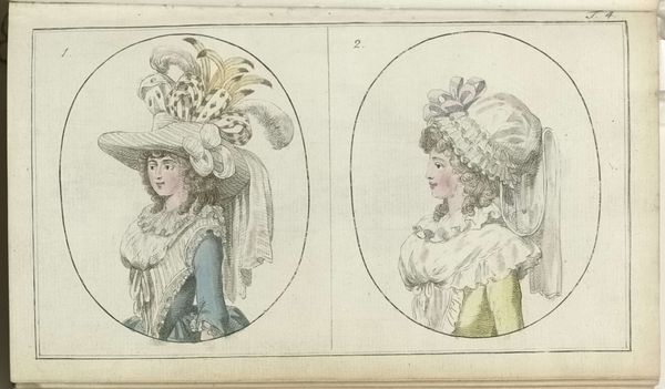Editor: So, here we have "Journal des Luxus und der Moden 1788, Band III, T.13" by Friedrich Justin Bertuch, dating back to 1788. It seems to be an illustration, using pen, ink and coloured pencils. Honestly, my first impression is…those hairstyles are utterly wild. What on earth do you make of this piece? Curator: Wild indeed! But, beyond the, shall we say, *ambitious* hairstyles, lies a glimpse into a world obsessed with appearance. Look at the detail, almost forensic, in the rendering of the fabrics and the towering… edifices. It's almost a performance, don't you think? A theatre of self-presentation. These weren't just hairstyles, they were statements! Almost architectural! Doesn’t it make you wonder about the women underneath all that? Editor: Absolutely. Statements of…wealth? Status? The higher the hair, the higher the status? I guess the artist really captured that preoccupation with fashion and social standing. Curator: Precisely! And remember, this journal wasn’t just about showing clothes; it was about influencing taste. It shaped desires, fuelled trends, and arguably, upheld a certain social order. Now, do you notice anything particular about the way Bertuch uses line and color? Is there a sense of playfulness even within the formality? Editor: There's a delicate lightness to it all, isn't there? Even with the elaborate details, the colours are quite soft and the lines are clean and precise. It feels less like a rigid pronouncement and more like a gentle suggestion. Curator: Exactly! Bertuch, for me, captures the very essence of that fleeting moment—the cusp of revolution, a society teetering between opulence and… well, the guillotine. It’s funny and scary, like when you see a kitten with big fangs and red eyes... sort of! Editor: Oh, that’s a thought! I never considered the political context behind it all, but it's so visible now! Curator: History whispers in the most unlikely places! I do like this one: a quirky, interesting window into a lost, yet not too distant, world!