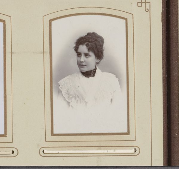 Curator: Let's turn our attention to this striking photograph, "Portret van een jonge vrouw," created sometime between 1903 and 1930 by Jan van Roon. It’s an excellent example of pictorialist photography, with a real genre-painting feel to it. Editor: Oh, hello there, melancholic muse. She’s got that quiet intensity, like a whispered secret trapped in sepia tones. I wonder what story she could tell, or what was kept hidden away back then… Curator: Exactly. The image compels us to consider the representation of women during that era, particularly within the confines of domesticity and societal expectations. Her gaze, direct yet subtly vulnerable, sparks a dialogue about female agency and visibility. Editor: There's something about the high-necked dress, the demure pose, like she’s carefully composed… but, man, I wanna know if she’s seething underneath, or just quietly dreaming of running away. Makes me wonder, who was calling the shots for her style. Was this Jan riffing on genre paintings or working with her own vibe? Curator: Van Roon's technique of pictorialism often involved manipulating the photographic print to resemble painting or etching, reflecting a broader cultural trend of elevating photography to the status of fine art. It's important to consider how class and privilege influenced these artistic choices, the types of portraiture they allowed. Editor: You said it. It makes you think: If she had the mic then, if she had a TikTok or something, what wild truth bombs would she drop? Is she a hopeless romantic or is that dress suffocating her dreams? I bet if we gave her a poetry book and a motorcycle, that's her happy place right there! Curator: The photo also raises questions about the photographer's gaze and the power dynamics inherent in portraiture. How does Van Roon's perspective shape our understanding of this woman? Editor: Agreed. It feels a bit like history froze her in that one pose, so it’s almost our job now to bring a little chaotic empathy into the room, let her imagine breaking out, give that photo a story to tell… Curator: Indeed, engaging with works like these prompts us to critically examine the historical frameworks that inform our interpretations of gender, identity, and artistic expression. It reminds us that every image is imbued with layers of meaning and power dynamics. Editor: Absolutely. For me, looking at her, is almost a dare to let loose my own stories too. You see the truth behind their posed appearances and go, yeah, those long gone ladies can be my sisters and inspiration any day.