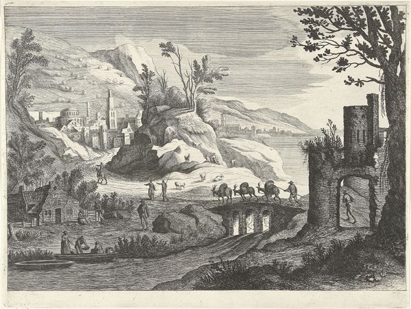This is a landscape scene made through etching on paper by an anonymous artist. The material is humble, but the effect is rich. Using a metal needle to incise lines on a wax-coated plate, which is then bathed in acid, the artist harnessed the corrosive power of this mordant to create a design that would hold ink. The matrix and paper were then pressed together, transferring the image. Look closely, and you'll see a certain crispness achieved through the etcher's careful touch. The way the architecture is rendered, and the distant mountains – all this is achieved through subtle gradations of tone. Think of etching as an early form of industrial image-making. It allowed for the relatively quick and inexpensive production of multiple images. In its time, this print was a powerful tool of communication and commerce, allowing people to see landscapes far beyond their own horizons. This artwork shows us how the materials and methods of production are key to understanding not only the image itself, but also its cultural significance.