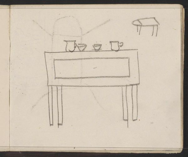This sketch, possibly of an insect, was made by Carel Adolph Lion Cachet, using graphite on paper. The soft, grainy texture of the graphite lends a provisional quality to the drawing, like a fleeting thought captured in lines. Look closely, and you can see how the artist built up the forms with simple strokes. The insect emerges from the page as a geometric, almost architectural figure, with a sense of humor. While seemingly modest, the medium of graphite connects to a complex history. Graphite pencils became widely available in the 19th century due to industrial production, making drawing accessible to a broader public. This small sketch is therefore embedded in the larger story of material innovation, and the increasing democratization of artmaking. It reminds us that even the simplest materials carry layers of cultural meaning.