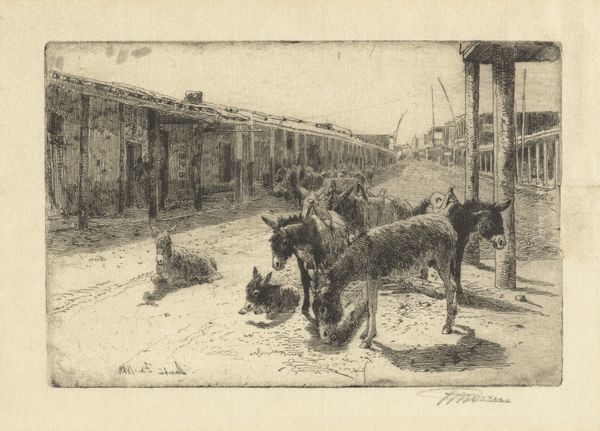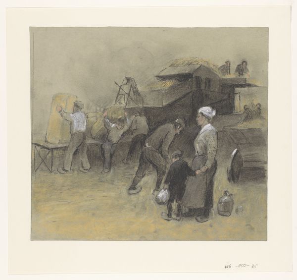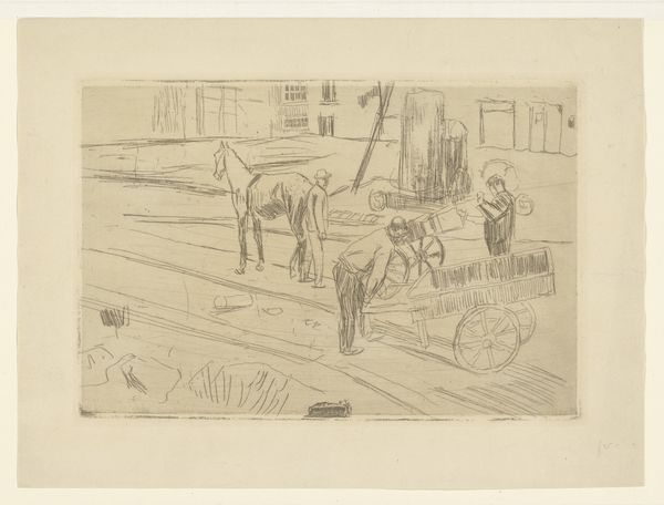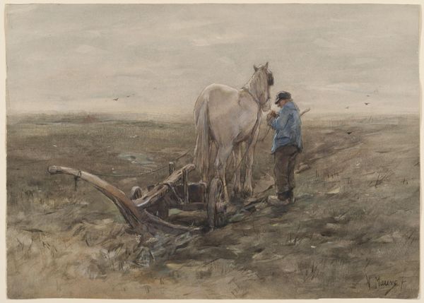 Curator: George Hendrik Breitner's watercolor, "Bouwterrein Oud-West te Amsterdam," created around 1900, offers us a peek into a bustling construction site. It's currently held in the Rijksmuseum collection. Editor: Immediately, it feels almost melancholic. The muted palette and the hardworking figures… There's a stillness in the foreground juxtaposed with what I imagine would be noisy labor in the distance. Curator: It's interesting you mention stillness, because Breitner was fascinated with capturing the dynamism of city life. Look closely at how he uses loose brushstrokes. The medium really helps create this hazy atmosphere and this sense of momentary capturing a very dynamic moment. Editor: Exactly! It makes me think about the physicality of building. Consider the labor here, all these people contributing to one huge thing that becomes the city we know. We see wood, soil, brick, even the harnesses of the workhorse, a beautiful animal itself a crucial piece of technology. The process dominates! Curator: And I think Breitner’s eye really romanticizes it! Though, I'd agree the work captures the spirit of the laborers and the relationship they have with their resources around them. I see the construction site becoming a metaphor. Editor: Metaphor how? The fleeting nature of beauty amid the gritty reality? Curator: Perhaps! Breitner saw beauty everywhere and had quite an ability to distill everyday encounters. Look how the work focuses on both man and machine, working in tandem to transform the world around them. Editor: Yes, the composition leads me through. First the horse, so powerful and resigned, then along the laborers in a midground of browns, tans, and blues that feels chaotic. Lastly, it delivers you out to this barely colored skyline and cityscape which lacks any of the painting's attention to detail. You can see the process as consumption, but maybe there is some cost. Curator: Perhaps you're right about some unseen cost; or perhaps the work is Breitner offering an attempt to capture an era where the world was starting to modernize around him. It’s hard not to love what is there; a sense of hope and transformation. Editor: Definitely some magic captured! For me, it highlights the dignity of labor and reminds us of the concrete foundation upon which our cities are built—brick by painstaking brick.