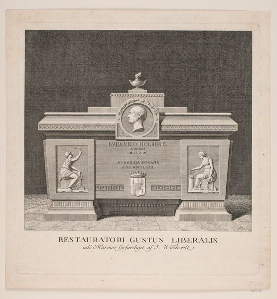 J.F. Clemens created this print of L. Holberg's sarcophagus in Sorø Church. As an artist working in the late 18th and early 19th century, Clemens navigated a world of shifting artistic styles, from the late Baroque to the rise of Neoclassicism. This print captures the Neoclassical aesthetic, evident in its symmetrical composition and the use of classical motifs, which were favored by European elites. Holberg, a playwright and intellectual, lived in a society marked by rigid class structures, where patronage and reputation were crucial for success. The print shows two female figures on either side of the sarcophagus, with the figure on the left holding a theater mask. These figures act as allegories to the different parts of Holberg's identity. Consider how the image itself functions as a piece of cultural preservation. It invites us to reflect on the way society remembers and honors its luminaries, and to recognize the artistic and intellectual currents that shaped their legacies. It asks us to consider how power and representation intersect in the creation of cultural memory.
