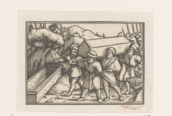 Curator: Isn’t it something how lines alone can conjure up so much energy? I see that first here, in the Rijksmuseum's "Moses Beholdeth the Victory of Saul over the Army of Amalek," a woodcut dating back to 1522. Editor: It feels cramped, chaotic! The energy is definitely there, almost like a swarm. The battle scene feels… well, vicious. Curator: Vicious, yes. The print teems with life, doesn't it? And that viciousness is heightened by the contrast between the earthly turmoil down below and the divine observation of Moses on the left, backed up by the figure in the sky and by God Himself. He’s basically knee-to-sky in prayer, witnessing Saul’s victory over the Amalekites. This piece, from an unknown artist, truly captures a dramatic narrative. Editor: You’re right, it is clever. But looking closer, there is so much detail crammed into such a tiny space. Take the formal composition—the high horizon line, for instance, forces all that battling directly towards us, making it inescapable. Curator: Right! The artist manages to imbue such a small space with immense weight and movement, a swirling dynamism I always respond to, like standing at the precipice of a dream, peering down into it. The details create an atmosphere almost of breathlessness, as though you're holding onto a secret. What secret, I'm never sure... maybe that’s its peculiar magic. Editor: Secrets within lines, hmm? I like how the artist managed to show God so differently. Almost separate. As I trace the lines—it makes me think more and more about structural composition, the tension between vertical and horizontal thrusts; but, ultimately, I return to those meticulously placed figures and how that energy holds my attention. It is definitely successful at achieving… momentum. Curator: Absolutely. It shows how powerful visual storytelling can be. It proves there are no limits. Editor: No limits indeed, I'm surprised how much this little picture gives us.