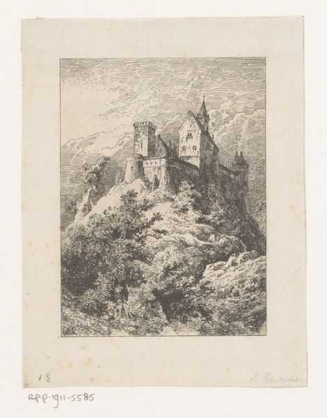 Editor: Here we have Alexandre Calame’s pencil drawing, "Landschap met ruïne en rustende figuur", dating from before 1855. It's incredible how much detail he achieves with just pencil on paper! The landscape almost feels monumental despite its intimate scale. What's your perspective on this piece? Curator: What interests me most is how Calame uses such a humble medium to engage with Romantic ideals. Think about the labor involved in producing graphite—mining, processing, shaping—all so that an artist can recreate an idealized vision of nature. And consider the social context: the rise of industrialization was concurrent with the romantic fascination for nature as it faded away in people's lives. The material itself, and its accessibility, allowed the rising middle class to produce images like this. Editor: That’s fascinating. I hadn't considered the accessibility aspect before. Do you think the figure within the landscape influences the message? Curator: Absolutely. The figure's inclusion connects the work to history-painting traditions but transforms them. They're dwarfed by the ruin and the landscape. Calame suggests that materials, both the earth and the man-made graphite, can outlast any individual's impact. It speaks to an industrial-era anxiety about nature, decay, and individual insignificance, anxieties which created a need for idealized and, in some way, possessable views of nature. Editor: So, it's almost as if the drawing's material reality reflects and reinforces its thematic concerns? Curator: Precisely. The pencil marks themselves become a metaphor for the relationship between human industry, natural beauty, and historical decline. By choosing pencil, he chooses a readily accessible tool. How does mass production democratize the consumption and experience of Romanticism itself? Editor: I see what you mean! The materials really shape how we understand the piece, its social context, and how that feeds back into its meaning. It definitely gives me a lot to think about.