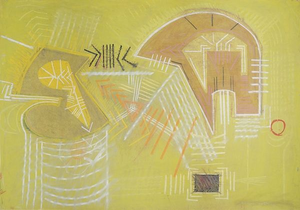 Editor: This is Constantin Flondor’s "Dialogue I" from 1967, created using mixed media. I am struck by its cryptic nature. The symbols almost feel like an unknown language, a puzzle box. What do you see in this piece, especially considering it's called "Dialogue"? Curator: The title certainly offers a crucial point of entry. What do the symbolic forms suggest to you in relation to discourse, to exchange? Consider, the imagery feels deeply encoded. Think of cartography or even musical notation—are they attempting to articulate something beyond simple representation? Do you think these geometric forms communicate ideas, emotions, perhaps a narrative understood only through shared cultural or personal references? Editor: It feels almost like a conversation between different technologies. The curved shapes with radiating lines contrast with the more angular, grid-like structures. Could it be about the dialogue between organic and inorganic forms, or between different eras of communication, say, the pre-digital and the digital? Curator: An interesting juxtaposition. Look closer at the repetition and variation of lines and shapes. Doesn’t that pattern resonate with ritualistic or coded behavior in specific cultures or belief systems? Notice the careful arrangement; each form placed intentionally to create a harmonious, yet unsettling visual language. Editor: I hadn’t thought about ritual! That adds another layer. Now I'm seeing these shapes as less about technology and more about a kind of symbolic language from a hidden society or forgotten tradition. The fact that it is a "dialogue" implies these symbols aren't arbitrary. Curator: Exactly! Symbols evolve over time. Their meanings change. Consider how different cultures interpret circles or lines. It’s about the cultural memory embedded within the image and what these dialogues might communicate about that collective unconscious. Editor: I get it! Now, understanding it is a visual record of symbolic evolution makes this far more engaging, transforming these static forms into dynamic artifacts filled with layers of significance. Thanks!