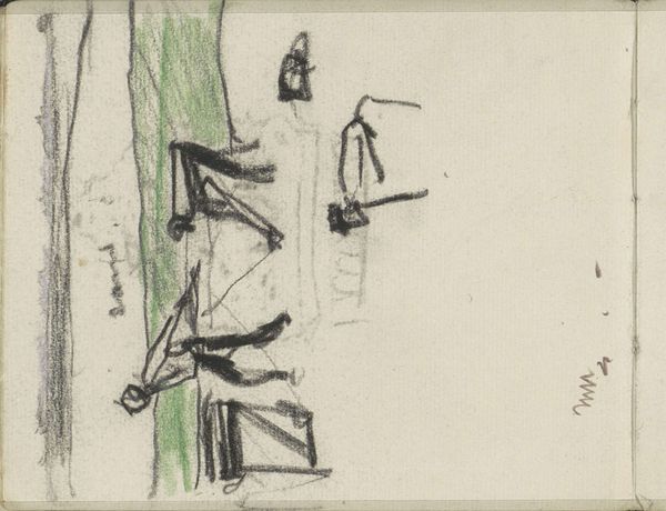 This undated drawing titled 'Standing and Seated Men' is by Isaac Israels and is in the collection of the Rijksmuseum. Executed in sketchy graphite lines, the composition is a flurry of hatching that coalesce into suggestive figures, their forms dissolving into abstraction. The artist prioritizes gesture and form, rather than detail. The quick, decisive marks create a sense of dynamism as the figures are rendered through a network of intersecting lines and tonal variations. The forms of the men emerge from the chaotic network of lines, but simultaneously seem to retreat back into it, and never fully materialize. The structural tension between representation and abstraction destabilizes conventional notions of form and space. Israels seems less concerned with capturing a realistic depiction of the men and instead captures the energy of the moment. This evokes a broader shift toward modern art's interest in capturing fleeting impressions rather than stable, fixed representations. The drawing functions not merely as a study, but also as an exploration of the materiality of the medium.