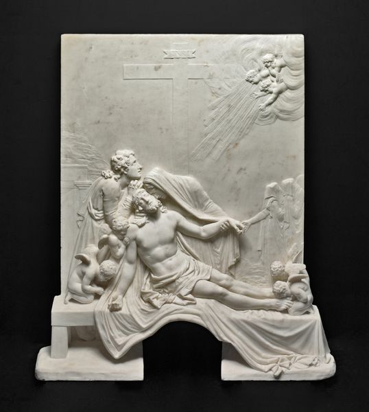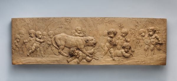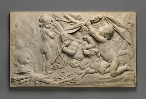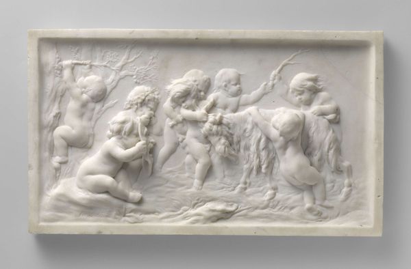 Editor: So, here we have Edme Bouchardon's marble relief, "Spring," part of a set created sometime between 1730 and 1765. The composition and figures seem so playful and idyllic, but it strikes me how much labor must have gone into carving all this detail out of solid stone. What can you tell me about this work? Curator: Considering the Rococo period in which Bouchardon worked, this piece is more than just decorative; it’s indicative of the societal demand for luxury goods and refined craftsmanship. Marble was a precious material. We need to ask, who commissioned this? For what purpose? Its very existence speaks to power structures and the allocation of resources. Editor: So, the value wasn't necessarily in the artistic expression itself, but in the demonstration of wealth and status? Curator: Precisely. And look closely at the carving. Think of the hours dedicated by skilled artisans - possibly even enslaved - to realize Bouchardon's vision. The material itself—marble—is also interesting. It had to be quarried, transported. Each stage signifies labor. Do you notice any contrast between the smoothness of the figures and the texture of the landscape? Editor: Now that you point it out, there is quite a stark difference! So the artist might be directing our eyes to the difference in what required less labor versus what was more meticulously labored? The skin looks very polished versus the foliage. Curator: Exactly. The smooth surface suggests accessibility, something tangible and graspable by the viewer, contrasting to the raw extraction and manufacture from source. Editor: I never considered that so much meaning could be derived just from the materials and the way they were handled! It makes me appreciate not just the image, but the hands that shaped it. Curator: Yes, this analysis reminds us that art objects are also products of material culture and social relationships.