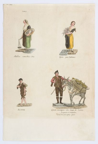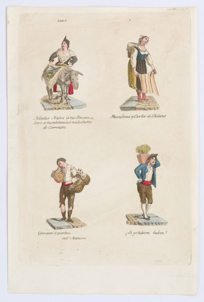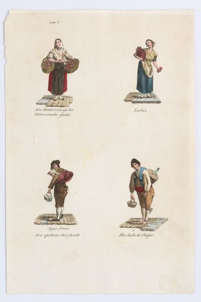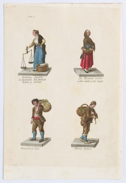 Curator: At first glance, it appears to be a somewhat naive, though charming, depiction of street life. Editor: Indeed. Let's delve into this print a bit. This is plate five from Miguel Gamborino’s series, ‘Los Gritos de Madrid,’ or 'The Cries of Madrid,' created between 1809 and 1817. Curator: "Cries" eh? It has an interesting, detached feeling to it; the four vendors almost appear to float in a white space, like isolated memories. Are these idealized types, or specific individuals? Editor: More types, I suspect. During this era, there was a growing fascination with capturing everyday life, fueled by Romanticism's interest in the common person and also a reflection of Spanish society under French occupation. Curator: The vendor of ‘albellanitas dulces,’ those little sweets, holding her basket: she strikes me as carrying echoes of earlier devotional figures, the Madonna perhaps. The basket evokes the cornucopia, a vessel of goodness…a far cry from the grim realities of war and occupation I would expect for this historical period. Editor: An astute observation. But even idealized images served a purpose. Consider the tradition of street cries. This series documents—and perhaps even romanticizes—the traditional occupations that were slowly fading. The figure grinding knives in this plate, for example. How much longer would he be practicing that craft? Curator: Each character inhabits their own symbolic frame, it appears. Even the seemingly humble knife grinder seems to have a touch of divine ordinance. In his stooped labor he performs an important function within this societal framework. But, his stance has also a darker interpretation… like a shrouded doomsday messenger? Editor: Fascinating. See how you draw so easily upon traditional visual repertoires, whereas my interest goes immediately to the socio-political ramifications of it all. I see this image as something of a record. Not necessarily of what IS, but how its maker wants history to remember the world that he documents. The figures seem almost archetypes. Curator: Perhaps both readings intertwine, and neither are mutually exclusive of each other? Editor: I appreciate you calling attention to those echoes of sacred iconography in a piece otherwise devoted to seemingly profane commercialism. Curator: Likewise, I would not have noticed so readily the effect of external historical forces. A truly multifaceted work.