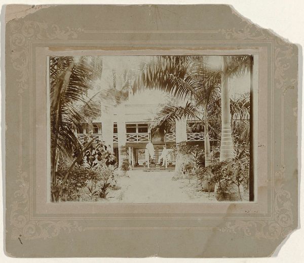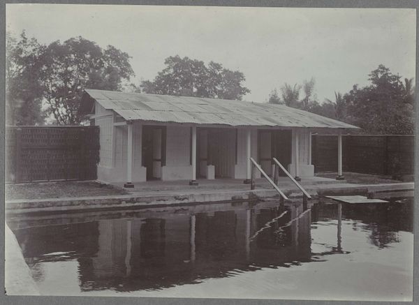 Curator: What we have here is a photograph by Kassian Céphas, entitled "Huis aan het water", or "House on the Water," created around 1886. Editor: It projects such a sense of stillness. The reflected light, the symmetrical structure, even the muted tones – all evoke a feeling of profound peace, as if the entire scene is holding its breath. Curator: Observe how the composition centers on the house itself, a study in horizontality emphasized by its low-slung roofline and the mirrored surface of the water. Note, too, how the tonal range moves subtly from dark foreground, medium middle ground to the very soft blacks and whites of the structure. The perspective flattens the depth, accentuating the picture's planarity. Editor: It’s also the careful orchestration of visual symbols. The house elevated almost temple-like over water suggests purity and reflection, quite literally mirrored in the water. Then you have those figures; they're presented at the midpoint between cultivated space of the villa and wild natural forest backdrop - they must occupy an intermediary role somehow? Curator: It's hard to say definitely, but it would certainly point to the human figure mediating between the structured space of the building and organic world beyond. Perhaps, though, more simply we should acknowledge the use of repeated form - observe those circular details above the eaves that echo in the plant forms below, the repeated human forms also serve a unifying function here. Editor: Agreed. The repeated forms give rhythm, a symbolic grounding in a cycle. The human forms remind of those ancient Eastern water rituals or, again, perhaps figures in the colonial landscape presented as 'civilizing' the natural. What is certainly clear, if less consciously orchestrated, is that the sepia tones give a beautiful historicised or perhaps melancholic aura today. Curator: Precisely. That melancholic air might also emanate from what structural theorists term the "absent presence"—the scene's palpable sense of existing for someone no longer here, a historical marker laid out carefully to invoke more complex responses now than perhaps it would on initial inspection. Editor: So much can rest upon such a balanced but emotionally stirring vista, indeed. Curator: Indeed; this image functions both as a descriptive record, yet contains powerful, complex emotional undercurrents revealed on analysis.