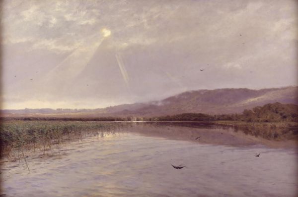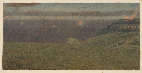 Curator: This is Frederic Edwin Church's "The Meteor of 1860," an oil-on-canvas rendering a celestial event observed that year. Editor: It's… somber. Ominous even. That dark, velvety sky and then the stark trail of the meteor. Was this supposed to be beautiful, or a warning? Curator: Church was deeply engaged with the scientific understanding of his time, alongside his Romantic sensibilities. He wasn't merely depicting a meteor; he was reflecting on humanity's place in the cosmos. Consider the historical context, the anxieties of the Civil War period looming over the United States. A fiery omen in the heavens was a powerful symbol. Editor: Symbol, yes, but let's think about the labor and the paint itself. Look at those fine, thin layers, creating that sense of depth and atmosphere. This wasn't mass-produced imagery; it required skilled labor, careful pigment mixing, the controlled application of oil. What was the cost, the time invested, to make something so seemingly transient feel so monumental? Curator: Absolutely. Church’s technique amplified the public fascination with the sky and celestial events. Artists such as Church played a vital role in mediating public understanding of natural phenomena during a time when science was rapidly advancing. Editor: Right, but what kind of pigments are creating that incredible luminescence of the meteor against the encroaching darkness? Was Church grinding those himself, or was he using commercially produced paints that were products of the industrial revolution? Understanding those material details adds another layer to interpreting the painting. Curator: Examining this work provides us with invaluable insight into the cultural values of the period. Editor: And what people valued putting their time and labor into creating! Something for us to contemplate as we look back, and consider how materials and representation shaped their view of the world.