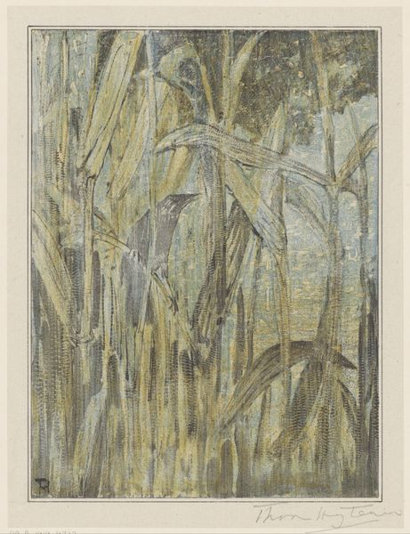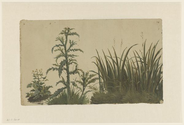 Curator: Here we have Peter Becker’s "Pflanzenstudie mit Rohrkolben," which translates to "Plant Study with Cattails." It’s currently held at the Städel Museum. Editor: My first impression is of stillness, a very hushed, almost dreamlike rendition of nature. The washes of watercolor create a hazy atmosphere. Curator: Indeed. The medium here is significant, given Becker’s engagement with plein-air painting, working outdoors directly in nature. Watercolour would have allowed portability and speed in capturing fleeting atmospheric effects. Editor: Precisely, and look at the way he’s handled the reed mace – the cattails themselves. The delicacy with which the leaves and the brown, cigar-shaped seed heads are rendered. It’s almost as if he’s capturing their texture, their very fibre, with the brush. I am really drawn into Becker's understanding of his materials. Curator: It invites contemplation, doesn't it? Consider the social context too: landscape art often reflected broader ideas about nature, national identity, and the sublime. This work suggests a quiet intimacy with the natural world. Editor: I see it. There's something about Becker's careful attention to materials that resists the grandiosity often associated with landscape. The making, the labor involved, it suggests a more grounded relationship to the land. This focus shifts us from romantic ideals to lived reality. Curator: That’s insightful. The role of artistic institutions is to invite conversation surrounding the art itself. Does this drawing lead us towards an appreciation of the handmade process in nature, as much as in art? It feels almost radical to see these simple plants represented without some overtly nationalistic association. Editor: Perhaps Becker is prompting us to rethink what we value both in art, and in the landscape around us. Focusing on the specific, not on some imagined, symbolic value. Curator: A final thought: I appreciate the interplay between the tangible elements of paint on paper and Becker’s attempt to depict something as inherently changeable as nature. Editor: I agree. It brings together, quite literally, the raw materials, the skills and Becker's intention. I think there is more here than just seeing.