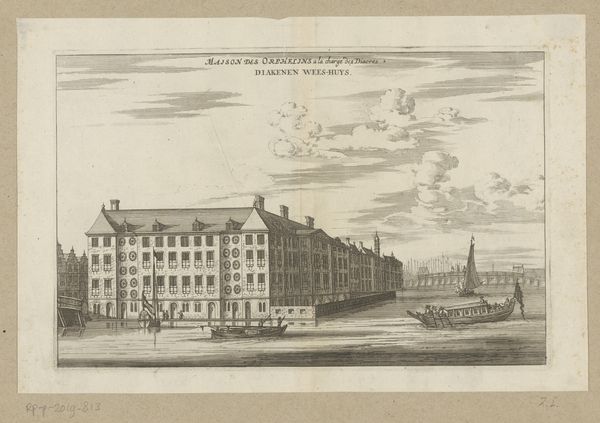 Jan (I) Smit’s etching, 'View of the Diaconieweeshuis in Amsterdam', presents us with a meticulously rendered waterscape. The composition is divided by the water, a mirror reflecting the architectural facades and the sky above. Notice how Smit employs linear perspective to draw the eye, not just towards the orphanage, but along the canal, creating depth and distance. The buildings are depicted with a strong emphasis on their geometric forms and the repetitive patterns of the windows, which suggest a structured, almost regimented environment. The overall organization suggests an attempt to impose order on the natural setting. Consider the symbolic weight of such an organized structure. It projects the values of the orphanage, such as discipline and social engineering, as it imposes a man-made order onto the flowing waters. The tension between this order and the natural elements—the water and the sky—invites us to consider the complex relationship between society and nature as viewed through the formal arrangement of lines and shapes. Ultimately, this tension provokes questions about control and the structuring of social spaces.
