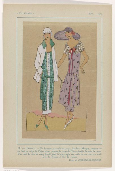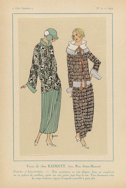 Editor: Here we have a pen and ink drawing titled "Tr\u00e8s Parisien, 1923, No 10: 10. - AMITI\u00c9. - Tr\u00e8s jolie cette robe..." made in 1923, currently residing in the Rijksmuseum. I’m immediately struck by how this image, ostensibly about fashion, captures something of the mood of female relationships. What do you see in this piece? Curator: The "Très Parisien" prints are fascinating documents of their time. Beyond the beautiful lines and the celebration of Art Deco aesthetics, this piece offers a glimpse into the construction of femininity and social dynamics in the 1920s. Notice how the women are posed – is there a sense of complicity, performance, or perhaps even constraint in these presentations? Consider how these images were consumed and what role they played in shaping societal expectations. Editor: Constraint? That's an interesting take. I mainly focused on "Amitie", which means friendship, or intimacy. I did not think to search beyond the surface. Curator: Well, what does "friendship" mean within the confines of 1920s Parisian society? Who had access to these circles, and whose stories are omitted from these fashion plates? What norms were perpetuated through seemingly harmless depictions of beautiful dresses? Think about gender roles, economic disparities, and the ever-present gaze of the male artist. Editor: So you’re saying the image subtly reinforces existing social hierarchies? Curator: Precisely. Fashion, like all forms of art, is never neutral. It can be both a tool for self-expression and a reflection, sometimes a reinforcement, of power structures. It also invites the debate and understanding of who determines the standards for beauty and style in the first place. Editor: This gives me a whole new lens to look at not just art, but magazines and commercial imagery! Thank you. Curator: A single image can contain so many layers, and thinking critically about context is the key to unlocking these meanings.