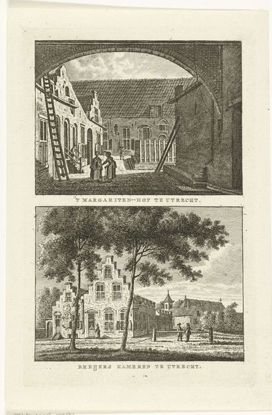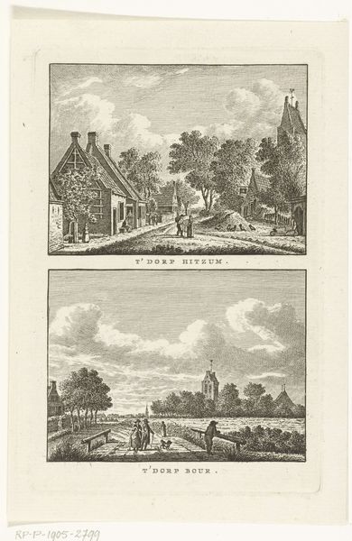 Curator: What captures my eye first about these prints by Carel Frederik Bendorp, entitled 'Twee dorpsgezichten te Hoedekenskerke', dating from between 1786 and 1792, is the way he presents these quiet, parallel narratives of village life. Editor: They’re quaint, almost unnervingly so! There's something so… ordered and contained. It's like a dollhouse view, you know? Two versions of serenity, separated by a line. Curator: Yes, they are a diptych presented one above the other, both detailed views rendered through etching and engraving. Notice how Bendorp utilizes linear precision to create a rich texture and form—it's quite exquisite. Editor: Absolutely, it’s almost mathematical. The use of hatching creates not only shadows and depth but also dictates the mood of each scene, don’t you think? Top print a little busy with action compared to the languid bottom print with its sleepy cows. Curator: Interesting take. It makes me wonder about his intentions here. The prints portray everyday life in Hoedekenskerke. What can these landscapes reveal about the social structures of the time? Are these romantic idylls or documentary observations? Editor: I think it is a bit of both and beyond! Take note of the architecture. There’s a very clear, controlled geometry at play—the houses, the church tower, the roads. All carefully placed to construct very calm little worlds. The way the trees softly frame the lower print seems significant in emphasizing peace. It's beautiful... in a way, it feels constructed, very different from reality. Curator: I agree. Bendorp's manipulation of perspective and the clear lines reflect an aesthetic ideal, shaping how viewers perceive this reality. It’s interesting how even the clouds and smoke contribute to this overall structural balance. Editor: This examination really enhances the appreciation, the prints start resonating even louder when the formalism gives you keys to decode all the historical and artistic decisions at play! Curator: Indeed, each element reveals choices about representation and conveys this historical narrative in profound ways. Thank you.