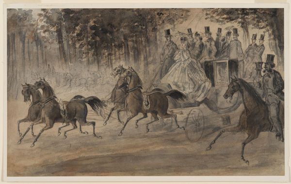 Jens Juel created this evocative drawing of a torchlit sleigh ride over Holmen's Bridge in Copenhagen. As an artist working in the late 18th century, Juel navigated a society steeped in tradition and shifting political landscapes. Sleigh rides were fashionable, and the bridge would have been a place to see and be seen. The drawing captures a moment of aristocratic leisure; the figures are shrouded in anonymity but we can assume that they are members of the Copenhagen elite. Juel renders classical statues, juxtaposing the cold, marble figures with the warmth of the social gathering. The drawing's use of light and shadow seems to evoke a sense of fleeting beauty. This gathering of the elite is made more ephemeral by the nature of the drawing itself. "En kanefart i Fakkelskin over Holmens bro" encapsulates a moment in time, where the privileges and pleasures of the few were captured with delicate artistry.