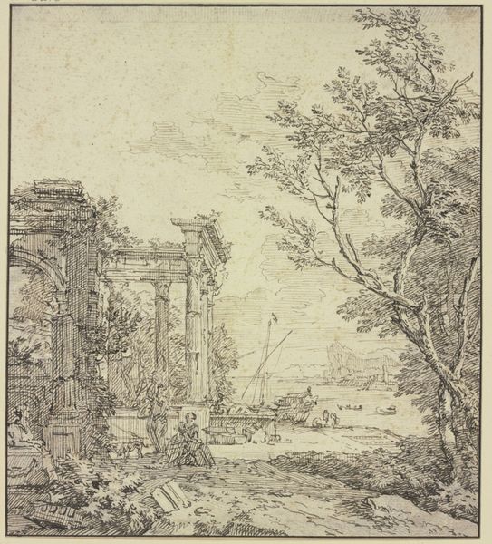 Editor: This is Claude Lorrain's "Villa di Papa Giulio," a drawing from around 1635 using pencil, ink, and watercolor. The rendering is beautiful, but I'm struck by how different the stone feels compared to the soft foliage in the background. How do you interpret this work? Curator: This piece, viewed through a materialist lens, reveals a fascinating intersection of labor and status. Consider the materials: ink, pencil, watercolor on paper. Relatively accessible, yet used to depict the Villa, a symbol of papal power and wealth, constructed, of course, using far more expensive materials extracted and crafted by armies of labourers. Editor: So you’re saying the materials themselves tell a story of inequality? Curator: Precisely. The drawing itself becomes a commodity, a representation of power circulated among a different class – perhaps aspiring artists, wealthy patrons, or even tourists. Look at the detail versus the broader sketch - there are social implications related to both labor and ownership embedded here. It almost documents the transformation of resources and toil into status. How do you see the implications of it being a drawing instead of the actual villa it depicts? Editor: I see what you mean, it definitely democratizes access to it. Someone who couldn’t travel to or enter the Villa Giulio could own this representation. The means of image production impacts who can "possess" it. Curator: Exactly. And consider the labour involved in its creation. Lorrain wasn’t just capturing an image, he was participating in a system where skill, materials, and representation intersected. The drawing becomes a microcosm of the socio-economic forces at play. Editor: It's amazing to think about how the seemingly simple act of drawing can reveal so much about the complex systems of production and power in 17th-century Rome. Thank you, I have a different appreciation of Lorrain's process now! Curator: Likewise. It shows the importance of understanding the tangible elements behind even the most ethereal artistic visions.