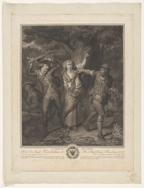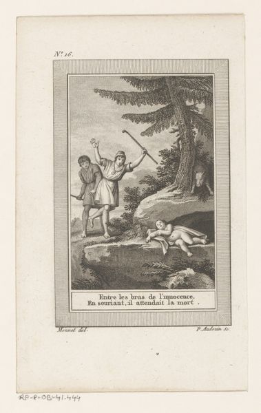 This print by Louis Croutelle presents us with a scene of a man addressing two travelers. The speaker stands on a rock, a visual elevation that symbolizes authority and insight. The figure's distinctive headwear immediately catches the eye, reminiscent of the "fool's cap" or "dunce cap," historically linked with marginality but also wisdom. Such a hat appears throughout visual culture. Consider the medieval court jester whose role was to speak truth to power, or the shamanic traditions where particular headdresses denote spiritual status. It is a marker of otherness but also, paradoxically, of heightened perception. The travelers look up, suggesting respect or perhaps disbelief. Gestures here play a significant role, for they convey states of mind and emotion which connect us to primal human experiences: of seeking advice, or finding oneself in a state of wonder. The scene creates a dynamic tension, inviting us to ponder the nature of guidance and enlightenment across time. How can we trust the word of a man in a hat?