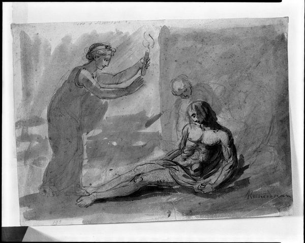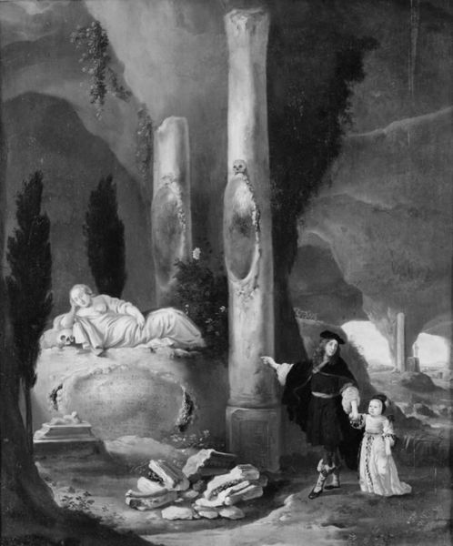 Curator: This somber scene we're observing is a 17th-century oil painting titled "Thisbe's Suicide by the Body Pyramus." Editor: It's arresting, this bleak landscape, punctuated by that distraught figure looming over the fallen man. The muted palette really amplifies the tragedy. Curator: Precisely. Note how the anonymous artist uses a limited tonal range, likely charcoal based as the support medium, to direct our focus. The composition places Thisbe centrally, almost illuminated against the darker foliage and buildings in the background. The diagonal placement of Pyramus's body creates a strong sense of drama and movement leading us toward the tower on the horizon. Editor: So, a purposeful construction to emphasize despair and guide the viewer's emotional experience. As an allegory about love and sacrifice, where does this fit into the visual rhetoric of its era? How was this kind of narrative painting functioning culturally? Was this meant to uphold social order, or critique it? Curator: It's interesting you mention that. Narrative painting during this period served varied purposes. Often it reflected prevailing attitudes on morality. This portrayal of Thisbe certainly seems to underscore the consequences of rash action—her love and desperation lead to self-destruction. Editor: The artist positions this tragedy, drawing it out in such dramatic terms. Is this heightened, almost theatrical emotion indicative of a broader artistic shift? I mean we are teetering on the edge of what will become Romanticism where emotional excess takes the center stage of art production, so I wonder where we stand on this divide and can the narrative drive the movement forward. Curator: Yes, you can already find features such as landscape painting as another emerging genre. We witness hints of realism with the bare feet and hands of Pyramus that contrast with the background structures like the pillars and distant tower. Editor: I find it really fascinating that, even with its dark themes, there's an undeniable formal beauty to the composition. The subtle interplay between shadow and light is very much a key for baroque esthetics that still captures attention centuries later. Curator: Indeed, that fusion of beauty and sorrow allows the piece to resonate so powerfully even today. A grim but compelling tableau from a distant era. Editor: Agreed. It certainly compels you to reflect on art's capability to intertwine personal suffering with enduring formal techniques.