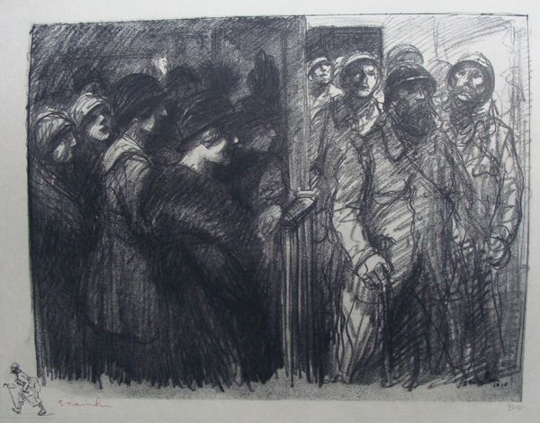 Théophile Alexandre Steinlen created "Les Veuves de Courrières," a lithograph that captures a moment of profound collective grief. In 1906, the Courrières mine disaster in northern France claimed over a thousand lives, leaving countless women and children widowed and orphaned. Steinlen, known for his social realism, turns his attention to the women left behind. Wrapped in dark shawls, their faces etched with sorrow, they stand together, a somber assembly of loss. The image evokes the shared identity and resilience formed through hardship. The women, mostly working-class, are presented not as passive victims but as figures of dignity. This visual representation challenges the traditional, often romanticized, depictions of mourning women in art history. Steinlen invites us to witness their emotional and economic struggles, highlighting how tragedy disproportionately affects marginalized communities. The artwork serves as a poignant reminder of the human cost of industrial progress and the enduring strength found in communal solidarity.