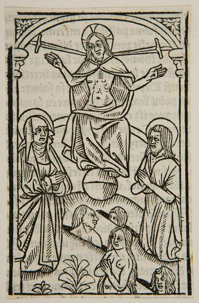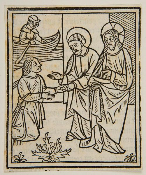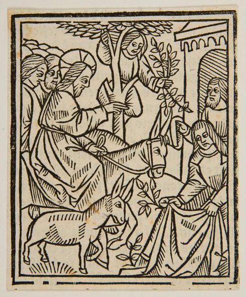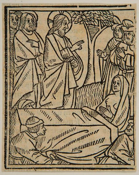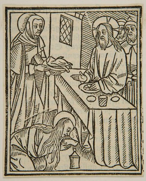Curator: Let's consider this striking, anonymous woodcut held at the Harvard Art Museums, "Mary Anoints Christ." The date of its creation remains unknown, but its thematic echoes resonate through centuries of art history and religious expression. What’s your immediate impression? Editor: It feels… stark. The thick lines, the high contrast… like a story etched in stone, or maybe burned into wood. So much reverence, but with an edge. Curator: Indeed. The piece brings up compelling questions around gender and power. Mary's act of anointing, often interpreted as humility, can also be seen as a profound act of agency within a patriarchal structure. Editor: I see what you mean. It’s a charged moment, this offering. The composition focuses on the intimate gesture while the men in the background observe. Curator: The choice of such stark black and white forces us to confront the simplicity and the complexity of the narrative. Editor: It's left me with a lot to consider, the weight of history, and the artist's hand. Curator: Precisely. And it reveals the intersectional forces at play. Editor: That starkness does leave its mark, doesn't it? A reminder of the power of simple lines to tell complicated stories.