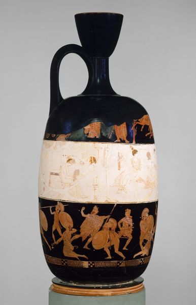Editor: Here we have a terracotta lekythos, or oil flask, created around 500 BC. What strikes me is how the figures are rendered with such distinct lines, almost like a comic strip, yet it feels ancient and powerful. How do you interpret this work, especially its imagery? Curator: It is fascinating how this vase encapsulates a whole world of cultural memory. Consider the figure of Hermes, with his winged sandals, forever traversing boundaries between the mortal and divine. He's an enduring symbol of swift communication, trade, but also transition –psychologically linking states of mind and experiences across different spheres. Editor: Transition… interesting. I guess, the image suggests a story that’s maybe incomplete, making me wonder about its significance. Curator: Exactly! It points to narrative and cultural memory. Do you notice anything about the seemingly simplistic drawing style combined with these highly stylized details? Editor: Well, I notice that the background is pretty sparse. It brings focus to the figures. I also note the border decoration around the neck of the lekythos. It seems almost purely ornamental. Curator: Quite right! While the figures enact stories imbued with deep-seated cultural values, the geometric motifs—the meanders, the palmettes—reinforce a sense of order, continuity. These symbolic borders are thresholds, in a way, between one's inner emotional space, and an outer, formalized cultural identity. How do you think this interplay between myth and order affects the experience of the user holding and using this oil flask? Editor: It gives a sense of belonging to a historical continuum... as if by holding the lekythos, you're also holding a connection to that ancient world and the stories it represents. Curator: Precisely. Even a utilitarian object like this becomes a vehicle for remembering, reinforcing, and carrying cultural memory through generations. It's a potent example of how visual symbols affect us, individually and collectively.